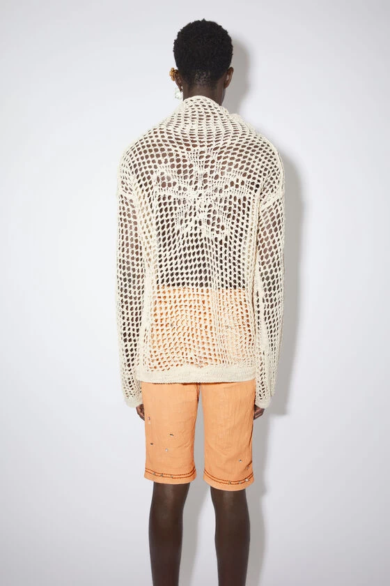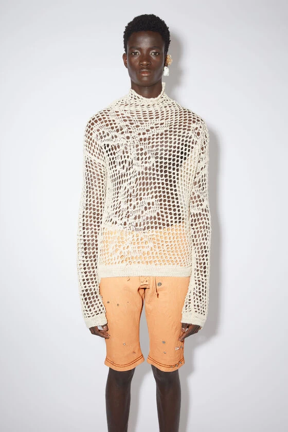 Acne Studios ecru beige knitted jumper is crafted from a wool blend yarn and mohair blend yarn, detailed with an open stitch with a flower pattern and irregular hemline. Cut to a relaxed fit with a turtle neck, elongated flared sleeves and below hip length.