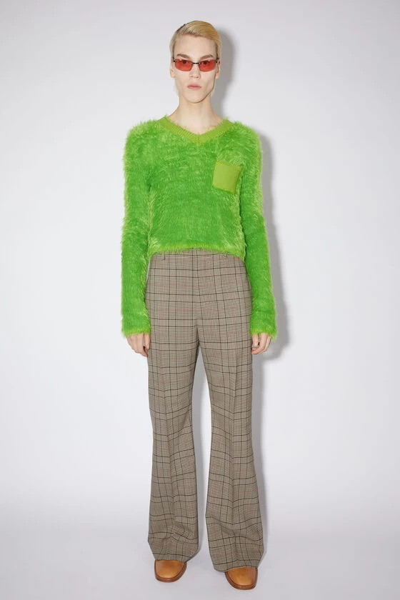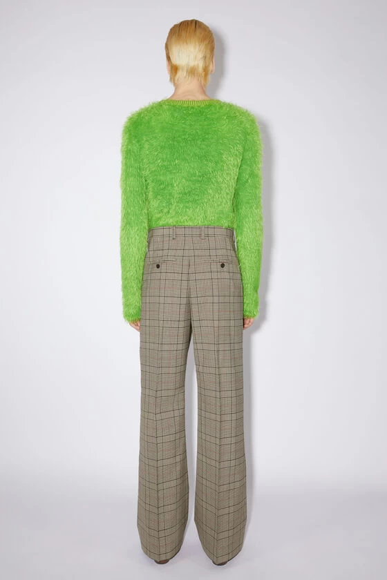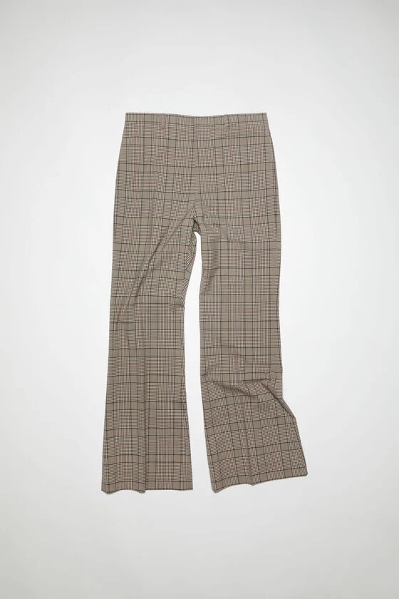 Acne Studios brown/red tailored trousers feature a Prince of Wales check crafted from a wool blend. Complete with pressed creases, side seam pockets and back pockets with button closure. Cut to a regular fit with a high rise and regular length.