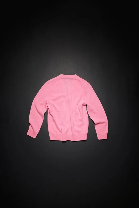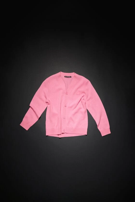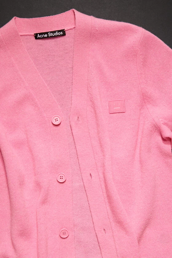 Acne Studios bubble pink cardigan features a face logo patch on the chest and is detailed with a ribbed v-neckline, cuffs and hem.