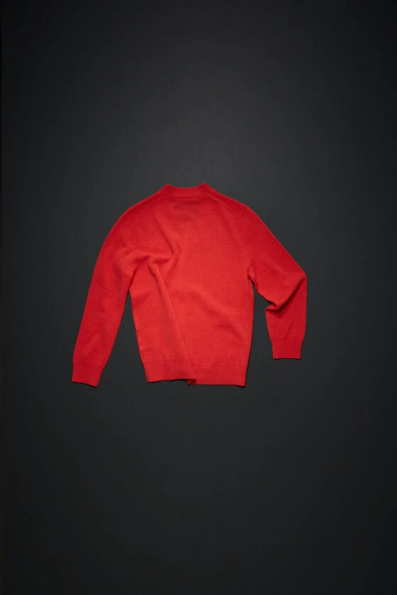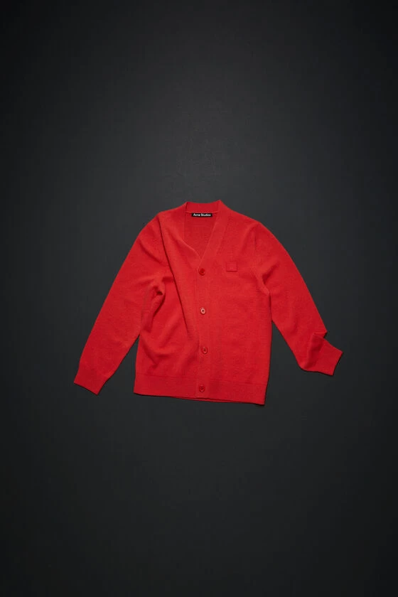Acne Studios sharp red cardigan features a face log patch on the chest and is detailed with a ribbed v-neckline, cuffs and hem.