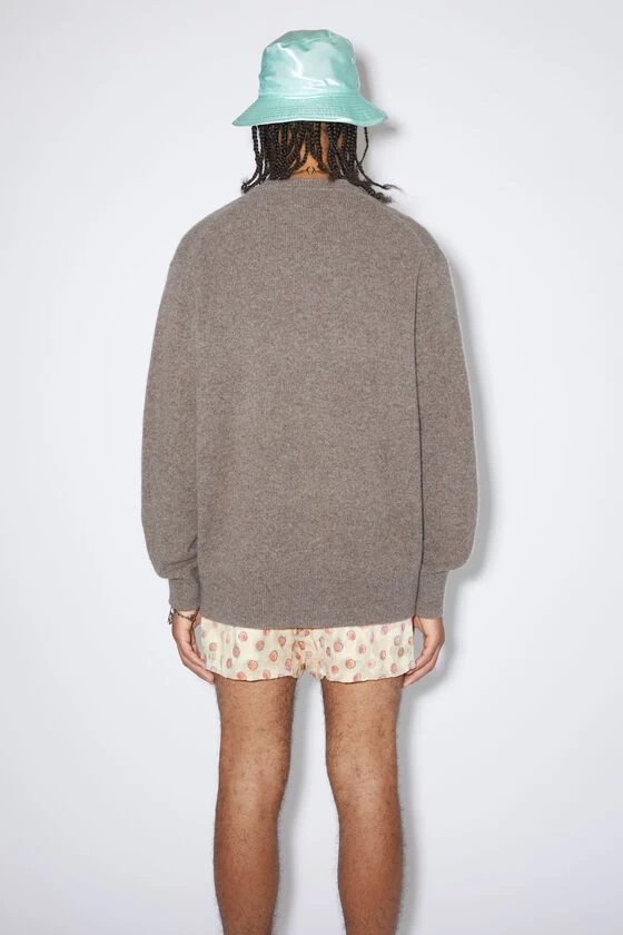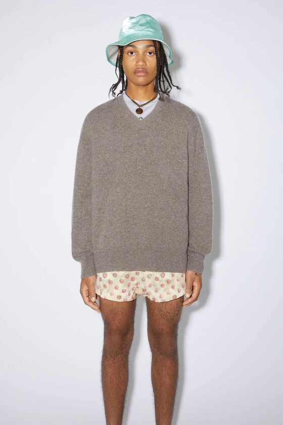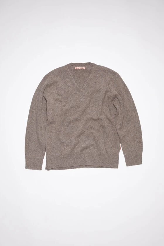 Acne Studios fox grey jumper is crafted from wool and cashmere blend with a soft hand feel, detailed with an Acne Studios pink flag label. Cut to a regular fit with a v-neckline and hip length.