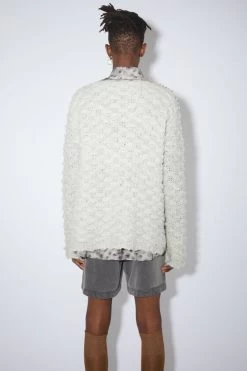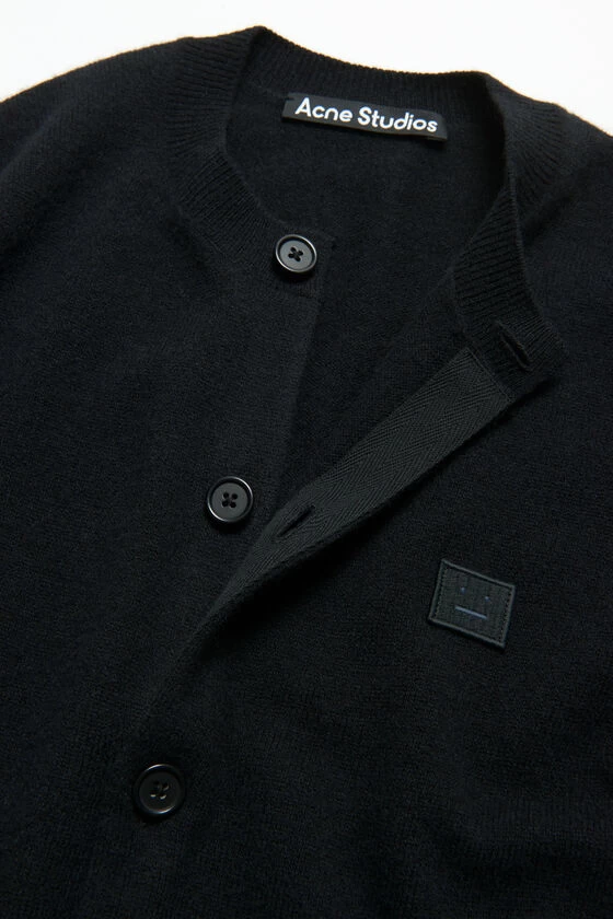 Acne Studios black crew neck cardigan features a tonal face logo patch and is made of lightweight wool. Completed with ribbed collar, cuffs, and hem detailing. Cut to a regular unisex fit and a slightly cropped length.