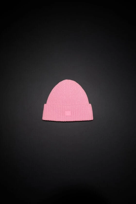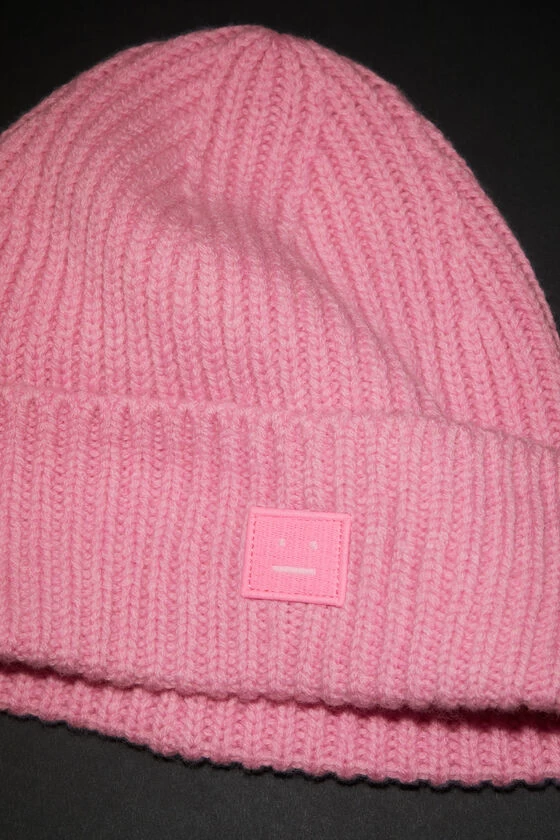 Acne Studios bubble pink children’s ribbed beanie hat is made of wool with a front face patch.