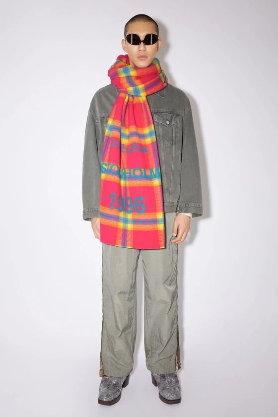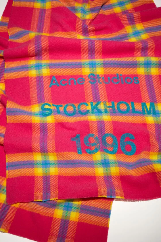 Acne Studios fuchsia/yellow checked scarf is made of felted wool with short frayed ends, and adorned with an Acne Studios 1996 print.