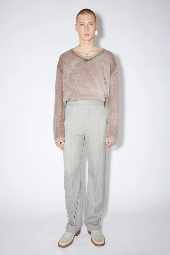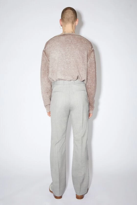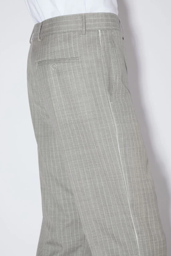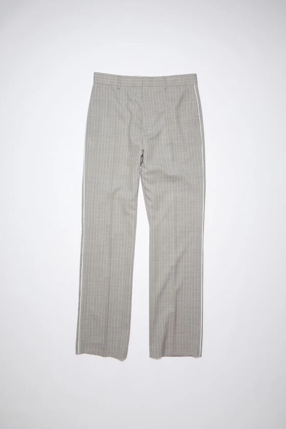 Acne Studios pearl grey tailored trousers are crafted from wool, detailed with contrast pinstripe detailing. Cut to a regular fit, fitted regular rise and long length.