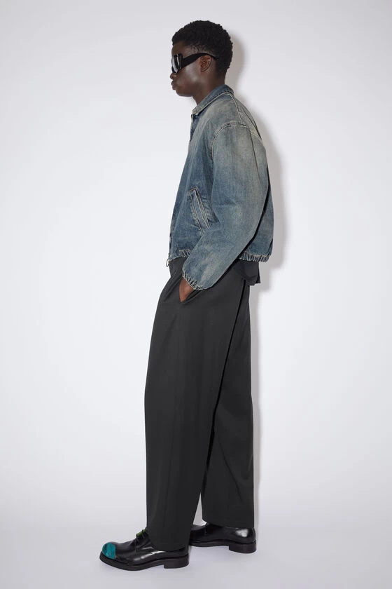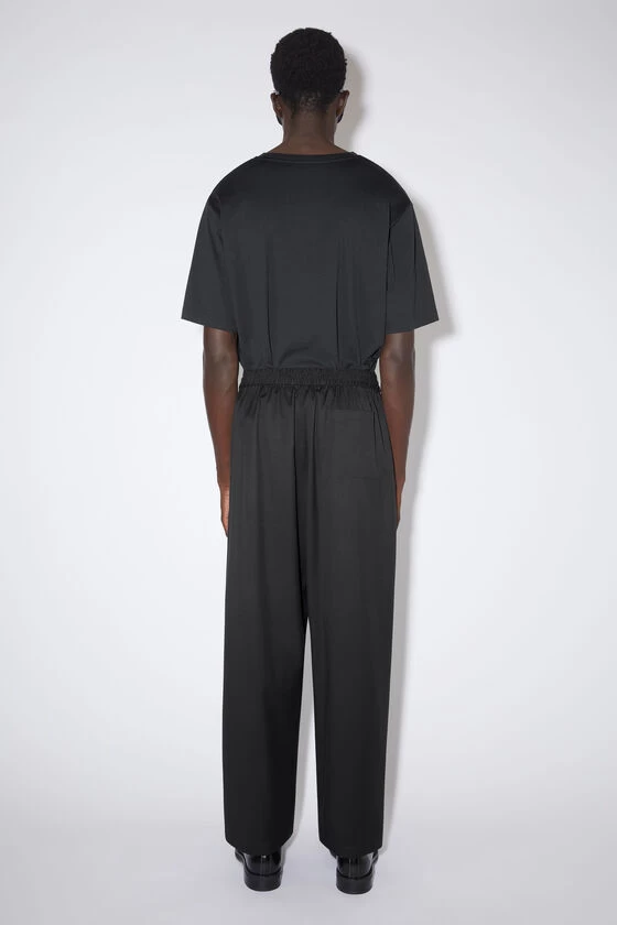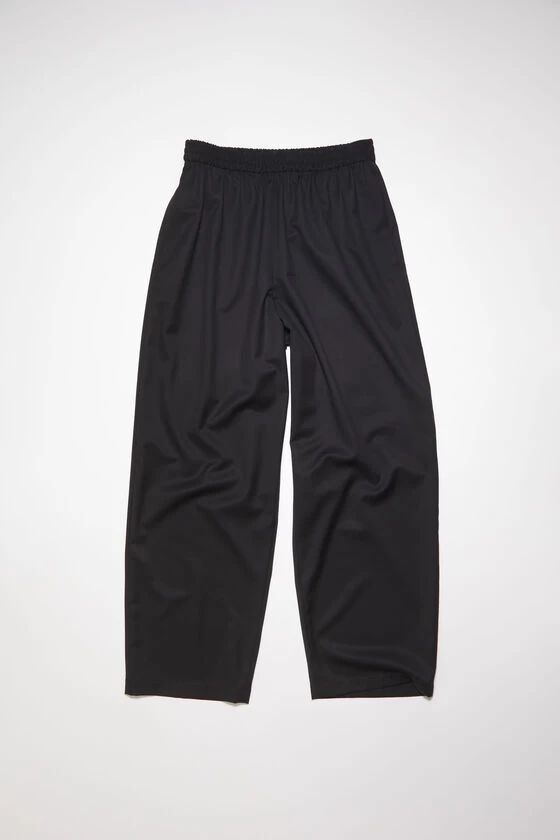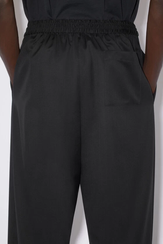 Acne Studios black suit trousers are crafted from soft fluid wool, detailed with an elasticated waistband, side pockets and back patch pocket. Cut to a relaxed fit with a regular rise and long length.